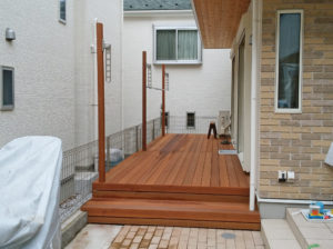 茶ノ木のウリンデッキは、柱は下からの一本ものですので、非常に丈夫です。他社の様にデッキ上に金物で取り付けるような、やわな施工は致しません。柱は、将来、パーゴラなどを追加する場合にも有効です。