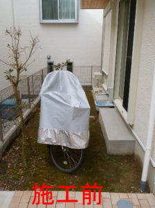 庭全体にウリンデッキを付け、物干しやターフに利用できるロング柱を立てました。