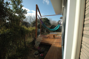 変形のウリンデッキに簡易パーゴラを付け、ハンモックを吊るします。