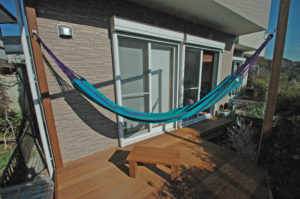 変形のウリンデッキに簡易パーゴラを付け、ハンモックを吊るします。