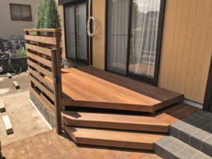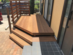 玄関アプローチと一体になるよう、ウリンデッキのステップは高さを合わせてます。