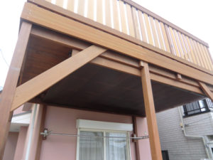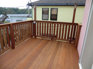 外壁リフォームの際、味気ないアルミ製のバルコニーを撤去、天然木のウリンで改装です。