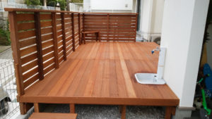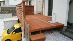 施主様より車庫上スペースの有効利用をご相談頂き、施工となりました。庭部分にも一部拡張し大きなウリンデッキ=アウトドアリビングになりました。