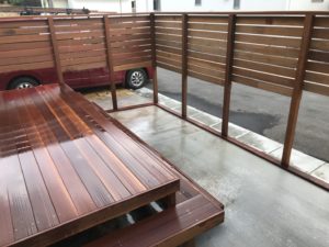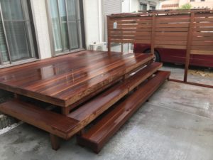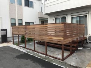 駐車場スペース(土間コン)を利用し、ロングステップの付いたウリンデッキと