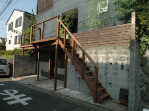 (鎌倉市)擁壁上の玄関へのアプローチ階段が腐ったため、二度と腐らないウリンでリニューアルです。