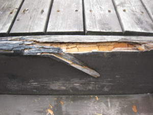 外見的には大丈夫のようですが、下地が腐り危険な状態です。釘が飛び出して来たら、下地が腐っている証拠です。