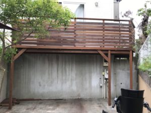 最新の施工例(鎌倉市)5月18日 車庫後ろを利用したハイデッキが腐ったため、ご来社・ご相談頂き、ウリンにてリニューアルです。
