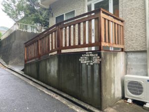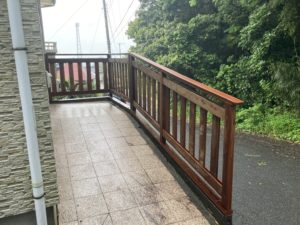 前回の大型ウリンデッキに引き続き、玄関前スロープにウリン手すりを施工です。
