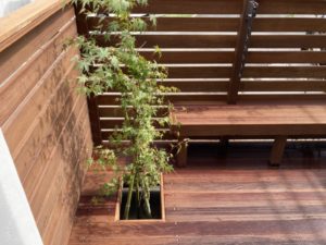 デッキ一部を開口し、シンボルツリーを生かします。ロングベンチを付け、憩いの場を演出します。