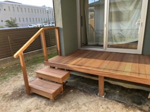 新築の庭にメインデッキです。庭への階段と手すりを付けました。