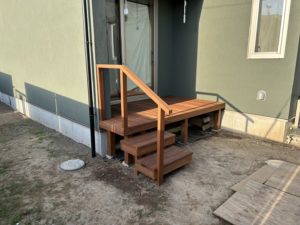 玄関側にも庭に降りられるよう、小デッキを作り、階段と手すりを付けました。