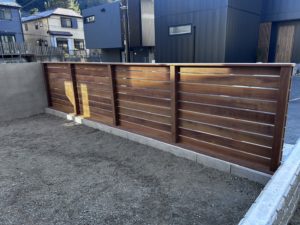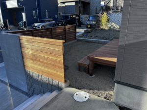 新築中からご相談を頂き、まずは小さめの縁側風ウリンデッキと境界フェンスを依頼されました。