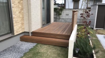 (栃木県小山市)最新の施工例 11月17日 新築の庭が完成、ウッドデッキのご相談を受け提案しました。 植栽スペースがあり、そのブロックの内側にウリンデッキを施工しました。 両サイドは庭へアクセス出