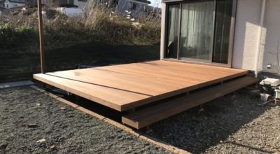 (愛甲郡)最新の施工例 12月18日 新築の庭にウッドデッキを付けたいとのご相談で来社され、実物のウリンを見て決定されました。 5.2mx3.6mの広々したステージデッキで、片側にロングステップを
