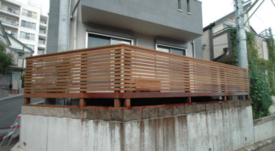 新築中からご相談を頂きました。 施工前 玄関横のリビングは通りに面しているため、目隠しフェンスが必要でした。ウッドデッキと一体のフェンスを付けることで、解決しました。新築中からのご相談でしたので、