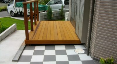 オープンガーデンにスタイリッシュデッキ 天然素材のウリン(アイアンウッド)は芝生とモザイクにも良く似合います。オープンスペースに出来るだけシンプルなデザインのウリンデッキを付けました。 施工前