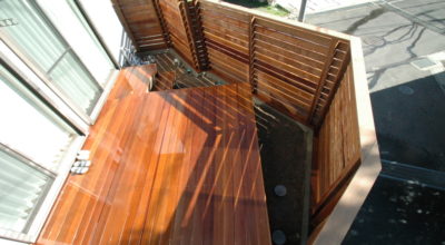 喫茶店の追加施工 最新の施工例 12月13日 2013年に2階のテラス席をウリン(アイアンウッド)で施工いたしました。 今回は、1階に防寒用のカーテンを付けるための躯体と、表に向いたカウンターを