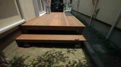 施工前です 折角のスペースを利用したいとのご相談を受け、設計施工しました。 施工後 玄関からもアプローチデッキ(ウリン)でウッドデッキに上がれます。 玄関から ステップで上がります まだ使用で