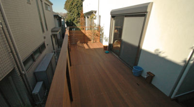 バルコニーを開口し(建築会社に依頼)、大型ウリンハイデッキを付けました。お客様は以前茶ノ木のウリンデッキを5年以上ご愛用頂き、ウリンの良さを十分ご理解の上、今回お引っ越し後にもウリンデッキを希望され