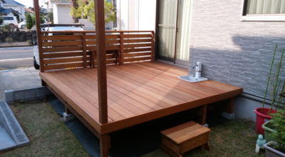 使い辛かった玄関前ポーチのスペースを、寛ぎの空間にしたいとのご希望にお応えしました。車庫スペースに余裕があるので、少し張り出して、ウリンデッキを広げます。 施工前と比べると、スペースが有効に活用出