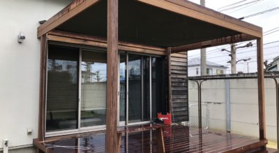(藤沢市)最新の施工例8月23日 ベランダ内にウッドデッキのご相談で来社されましたところ、 弊社ショールームのパーゴラとオーニングを見て、まずは先にパーゴラを優先する事になりました。 ベンチも作り