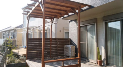 (藤沢市)最新の施工例8月4日 2018年に施工したお客様でウリンデッキをご愛用頂いてます。 小さなお子様も増え、夏の日差しを遮りたいとのご相談です。 フェンス側に追加柱と家側に化粧を兼ねたウリン材に