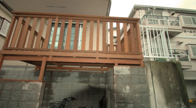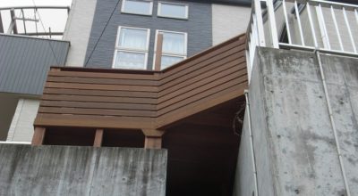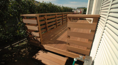 顧客からのご紹介で施工させて頂きました。 玄関に上がる擁壁上のスペースを有効に利用し、ウリンデッキを付けました。 デッキ下を通って玄関に上がることになりますが、却ってデッキ下が、雨除けを兼ね、自転車