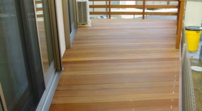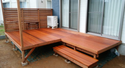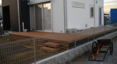 建物を囲むようにウリンデッキを施工しました。23平米の大型デッキです。 ウリンデッキ施工と同時に、立水栓を取り付け、庭への散水が楽になりました。 デッキ下は幕板を貼下げ、野良猫防止にするとともに、