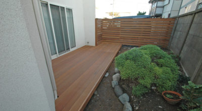 玄関から庭への通路が狭かったため、車庫に張り出しウリンデッキでスペースを確保しました。 施工前 施工後 庭側 玄関から 玄関から安心して庭に出られますし、防犯効果も期待できます。