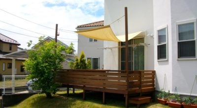 既存デッキが狭いため、腐ったのを機に、ウリンで拡張しました。車庫スペースを有効に使えるよう、柱を敷地一杯に飛ばし、デッキスペースを広げました。 既存デッキ 狭く、車庫スペースの邪魔にもなりました。