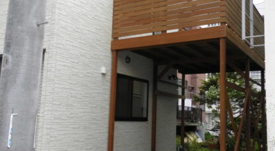 車庫上のスペースをウッドデッキにしたいとのご相談を受け、実現しました。 車2台分の間口に柱を入れたくないとのことで、鉄骨(亜鉛溶融メッキ)で躯体を作り、ウリン(アイアンウッド)のウッドデッキを乗せ